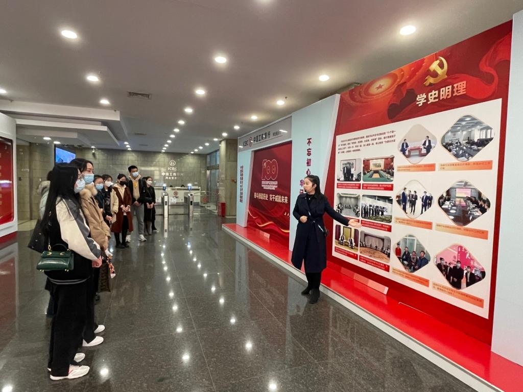 党员们首先参观了中国工商银行河北省分行制作的建党100周年党史文化墙,详细了解了中国工商银行的历史沿革以及在建国后支持国家经济建设、承担社会责任方面所作的工作。接着纪根强带领党员们一起学习了党的十九届六中全会精神,安文龙和党员们分享了应站在历史唯物主义的视角去看待党的三次历史决议,回顾历史、总结经验,从历史中汲取继续前进的智慧和力量。在互动环节,杨欣怡从账户出借、支付安全、敏感信息等方面给研究生党员们普及了移动金融风险防范知识。最后邱亚婷介绍了河北青年志愿者证的开发、运营和使用情况,号召更多的青年党员加入到志愿者服务行列中来,并给到场的研究生党员们进行了授证仪式。