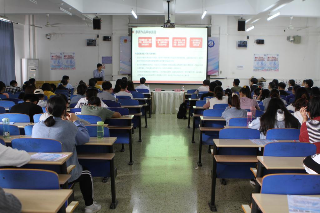 李文利阐述了大赛的宗旨,并向同学们介绍了往届学生取得的优异成绩。杜青从大赛概述、赛事环节、奖项设置及报名通道等方面对本次大赛做了详细的讲解。