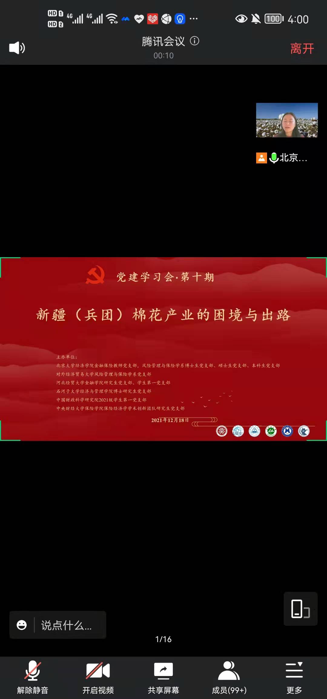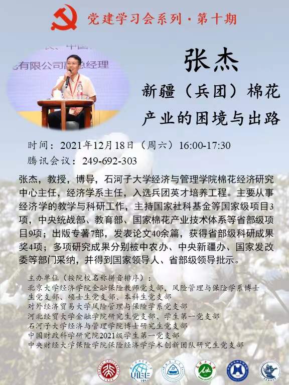 研究生党支部、学生第一党支部和北京大学经济学院金融保险教师党支部、风险管理与保险学系博士生党支部、硕士生党支部、本科生党支部,对外经济贸易大学风险管理与保险学系党支部,石河子大学经济与管理学院博士研究生党支部、中国财政科学院2021级博士研究生党支部,中央财经大学保险学院保险经济学学术创新团队党支部共同开展了支部共建活动,活动主题为“新疆(兵团)棉花产业的困境与出路”。本次学习活动采取线上腾讯会议的形式进行,六所高校党员代表100余人参加。
