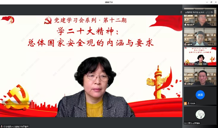 风险管理与保险学系教工党支部等六所高校和业界单位党员代表749人参加。交流会主题为“学二十大精神:总体国家安全观的内涵与要求”,主讲嘉宾是总体国家安全观研究中心办公室主任陈向阳。