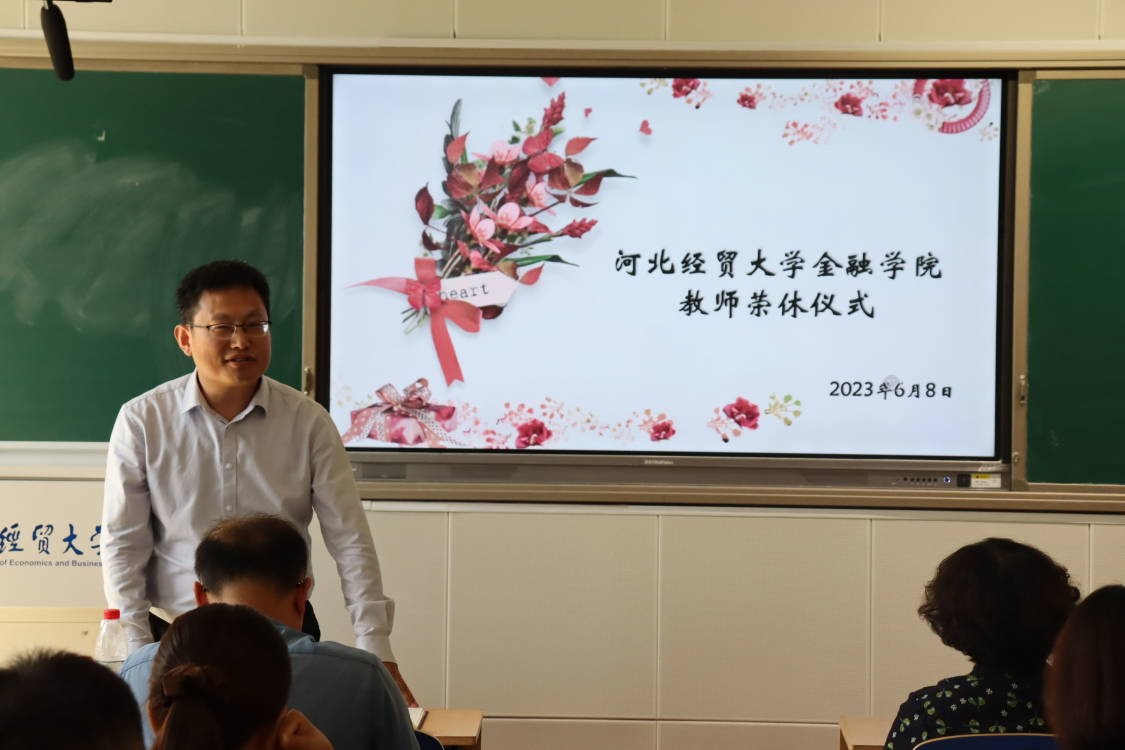 退休教职工荣休仪式在三教A104举行,学院全体教师及部分学生代表参加,荣休仪式由学院党委书记贾喜环主持。