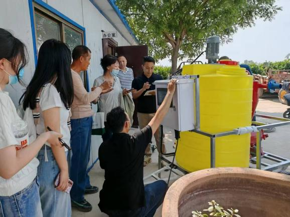 2025年5 月 13 日,金融科技系教师孙玮带领李思坤等6名学生,并邀请河北夏启物联网科技有限公司总经理刘嘉旭、工程师张健两位技术专家,赶赴望都当地企业——河北乾亿食品股份有限公司,为其捐赠并安装农业移动式水肥一体机一台,移动式水肥一体机是智慧农业的重要设备,具有智能调配和远程监控的特点,可根据不同地块和作物生长阶段的需求,精准调配水肥并输送至作物根系附近,能有效解决传统农业大水漫灌的问题,推动农业数字化转型。