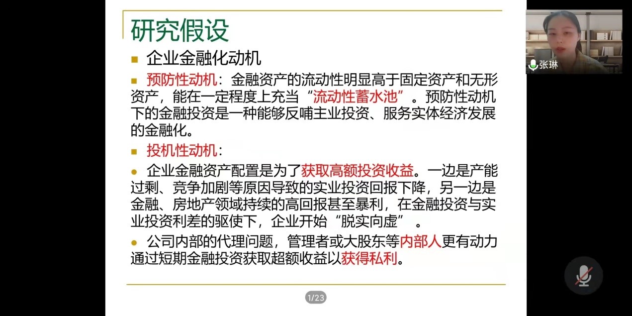 非金融企业应该回归初心、脱虚向实,合理控制其金融资产份额以降低风险。通过本次报告的讲解,同学们对企业金融化对银行贷款的影响有了更加全面的认识,对于我国企业金融化的经济后果和评估我国商业银行的信贷配置效率也有了更为深入的了解。