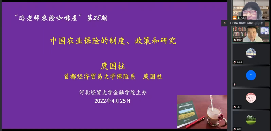 主办的主题为“中国农业保险的制度、政策和研究”学术报告顺利开展,活动以腾讯会议的方式线上举行。首都经济贸易大学保险系教授、农业保险研究所所长庹国柱应邀主讲。报告由冯文丽老师主持,近400名师生和学界业界人士参加。