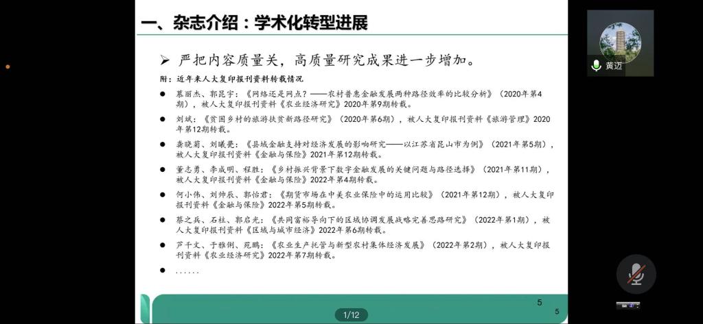 院长王重润主持。黄迈博士是《农村金融研究》执行副主编,先后主持国家社会科学基金、中央农办农业农村部乡村振兴专家咨询委员会软科学课题、中国博士后科学基金特别资助等研究项目,在国内外学术期刊发表论文30余篇。