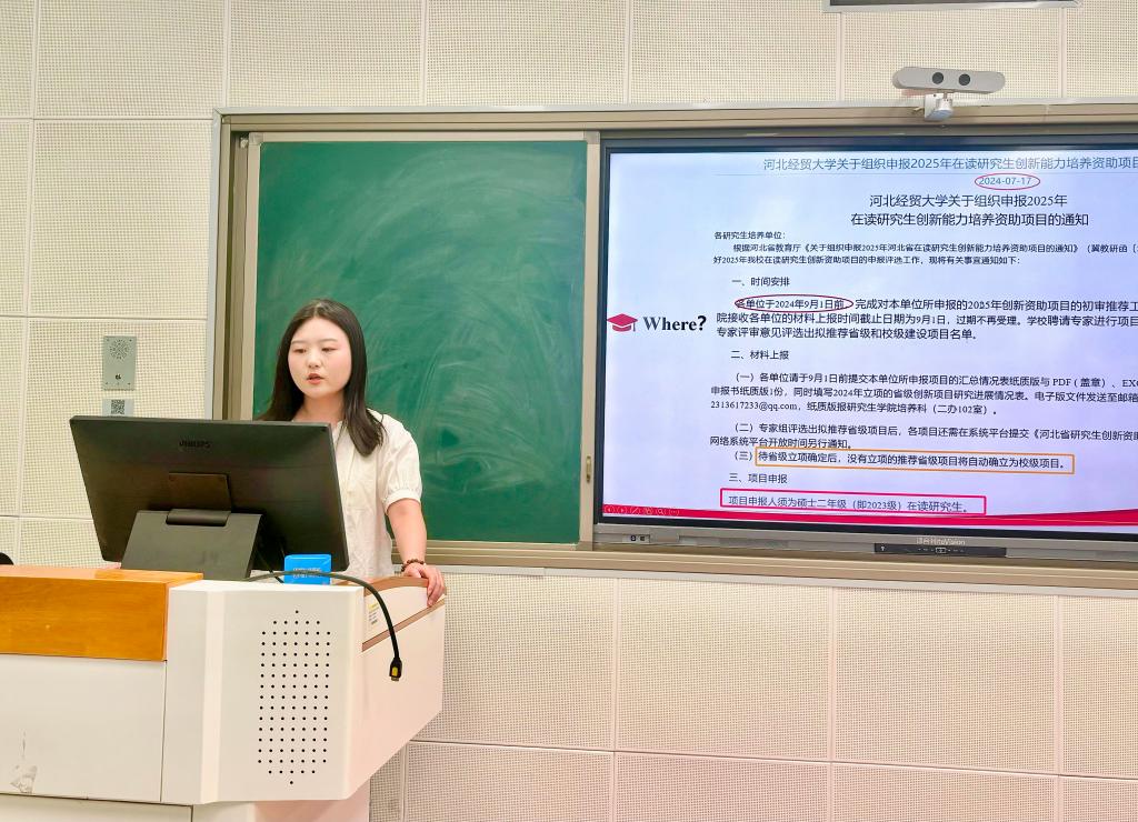 石可敬同学结合自身科研经历,详细解读了选题设计、课题申报与论文发表的要点。她提出:“选题应紧扣国家战略需求,注重理论结合实践;团队协作需明确分工,高效沟通”。闫子悦同学以2025年全国大学生创新创业比赛为例,梳理了项目书撰写、PPT制作及查重报告提交等环节的注意事项,并总结道:“项目书需突出创新点与可行性,PPT应精简直观,用数据和案例支撑逻辑”。