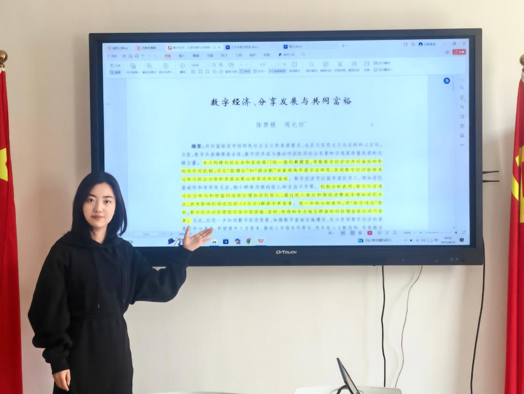 张紫清对该论文进行了详细解读,阐述了研究背景、方法与结论。研究发现,数字经济能够通过提升居民收入、缩小群体内部不平等来促进共同富裕,但数字鸿沟对部分群体的创收增益效应产生了阻碍,因此建议加快数字经济发展,优化收入分配,提升人力资本,以充分发挥数字经济的普惠性。张紫清的讲解清晰明了,引发了在场师生的热烈讨论。随后范院长也对同学们的科研提出了建议,强调在研究过程中要注重理论与实践相结合,关注社会热点问题,提升研究的针对性和实用性。他还鼓励同学们积极参与学术交流,拓宽视野,提升科研能力。