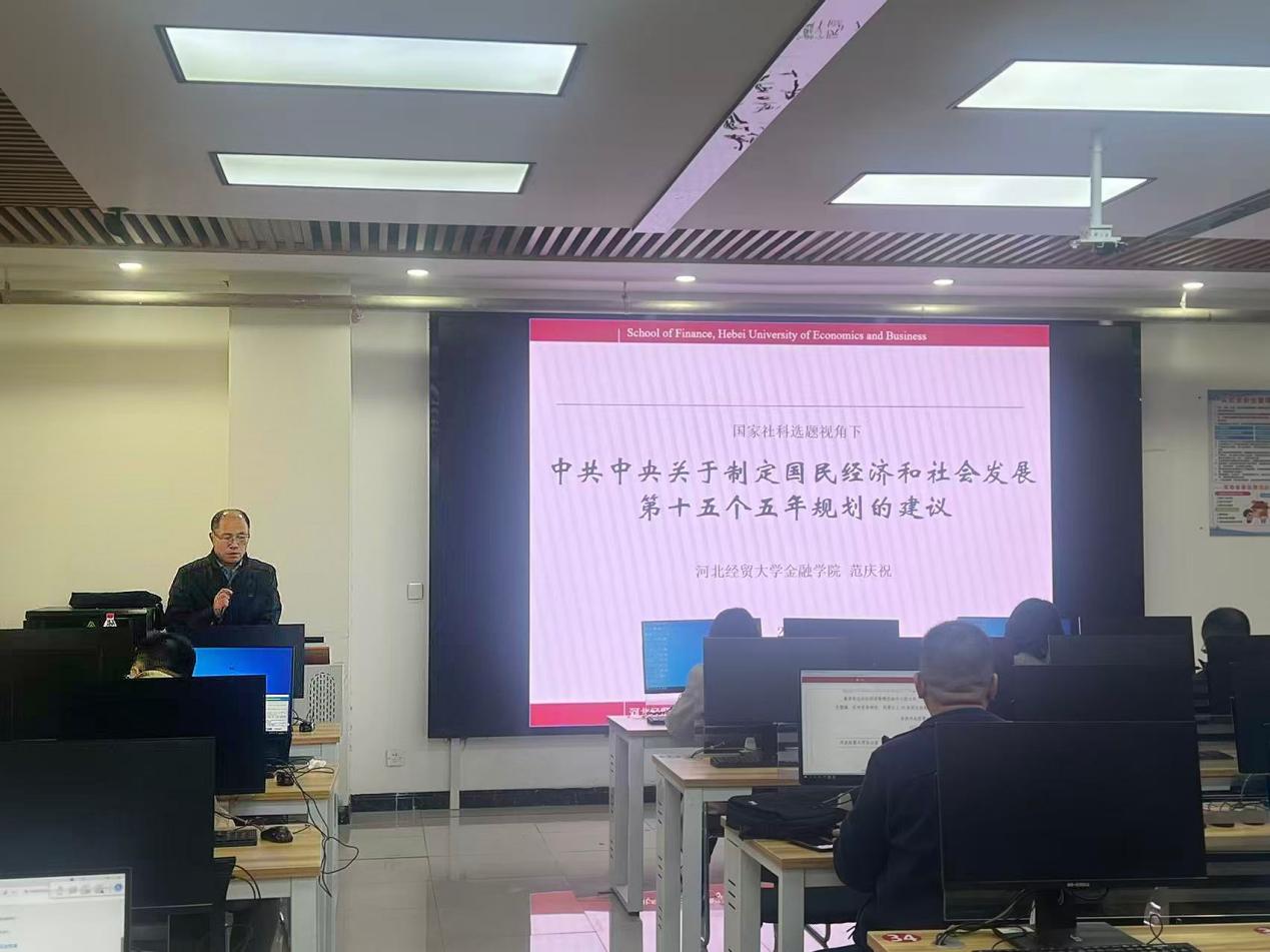 成功举办了“2026年国家课题申报辅导(第四期)”活动。本期辅导会由金融学院副院长范庆祝作“国家社科选题视角下《中共中央关于制定国民经济和社会发展第十五个五年规划的建议》(以下简称《建议》)”专题报告,深度解读《建议》的核心要义与选题导向,学院领导班子及全体教师参加了本次学习交流。