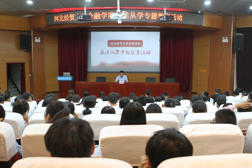 王冬坡书记从“廉洁文化”谈起,结合校规校纪从考试作弊、学术造假、伪造简历、工作违约等方面向同学们举例说明诚信的重要性,强调“诚信”是大学生的通行证。严禁为一己私利危害身边同学、老师的行为,引导同学们把诚信的外在道德约束内化为自己的思想品德,使自己成为时时处处诚实守信的现代文明人。