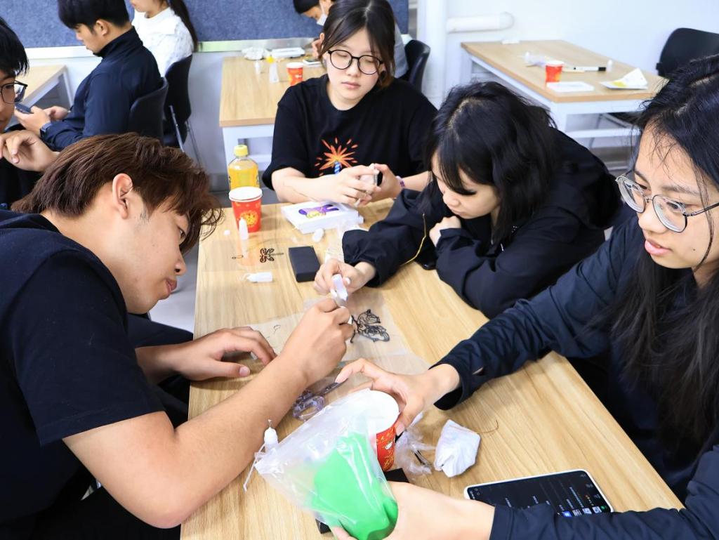 活动伊始,主讲人以图文并茂的形式介绍了掐丝珐琅的历史渊源与艺术价值。掐丝珐琅不仅是工艺美术的瑰宝,更在当代被赋予新的意义——其创作过程中的专注与色彩搭配的和谐美感,具有缓解焦虑、沉淀心灵的疗愈作用。在实践环节,师生们亲身体验了掐丝珐琅的制作流程。从选图、涂胶、掐丝到上色、封层,每一步都需耐心与细致。同学们以小组形式合作,在金属板上勾勒祥云、花鸟等传统纹样,再用珐琅彩砂填充出层次丰富的画面。活动现场气氛活跃,师生们沉浸于手工创作的乐趣中,感受传统技艺带来的精神放松与创造力释放。