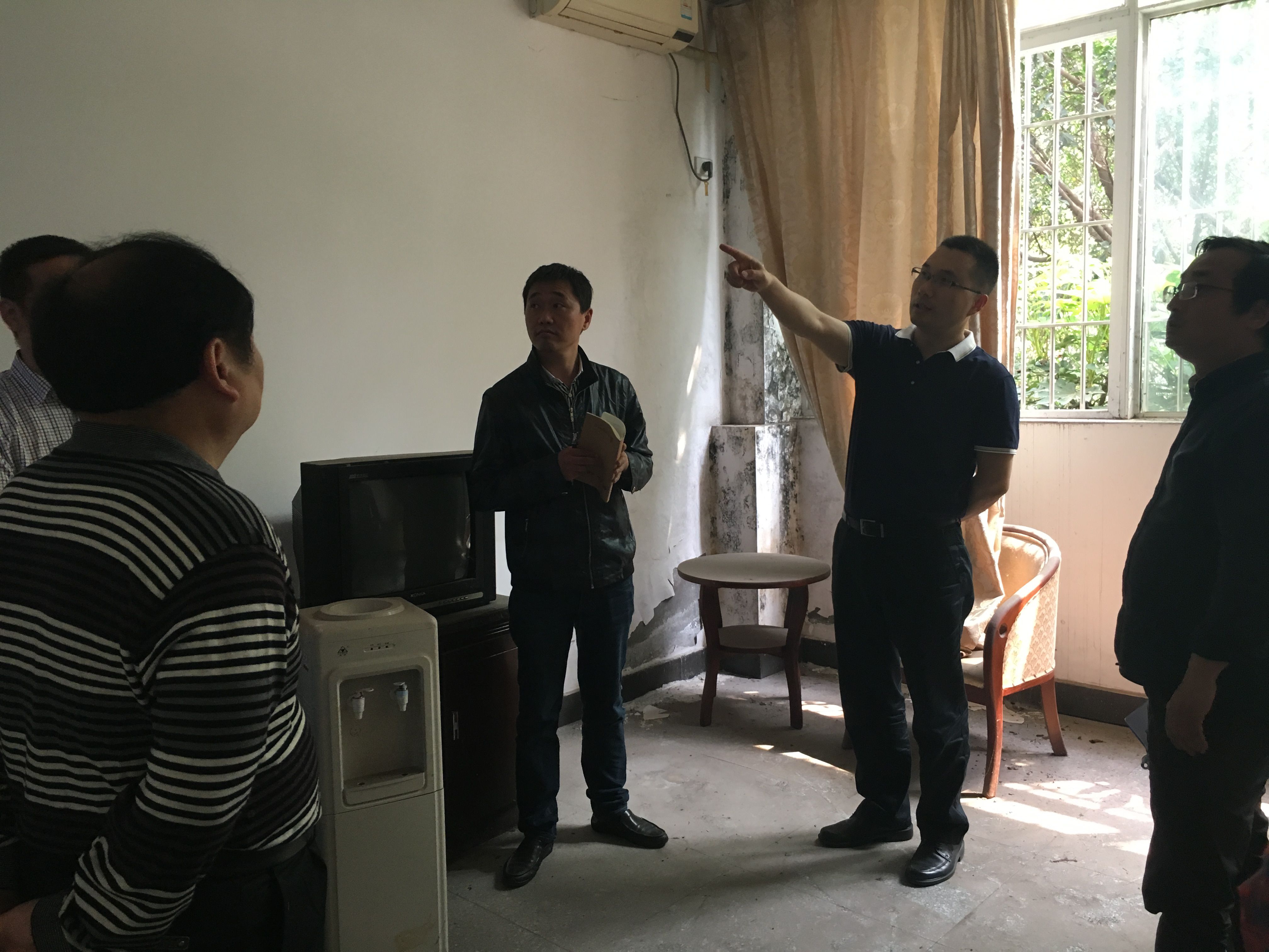 江洪一行认真察看房间结构布局、通风采光条件及生活配套设施等情况,耐心听取相关职能部门和建筑系设计团队改造设想的介绍,不时就改造方案与大家商讨,并提出指导意见。