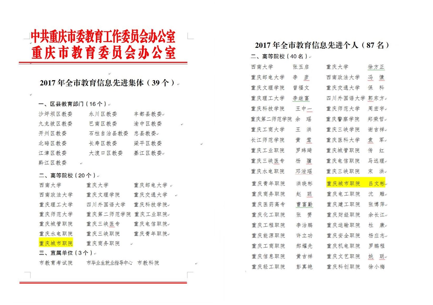 近日,中共重庆市委教育工委办公室重庆市教委办公室印发了关于2017年教育信息工作情况的通报,对39个教育信息工作先进集体和87名先进个人予以通报表扬。学院在高职高专院校信息工作积分排名中位列第8,获评2017年度教育信息工作先进单位,学院党政办公室吕文彬同志荣获教育信息工作先进个人。
