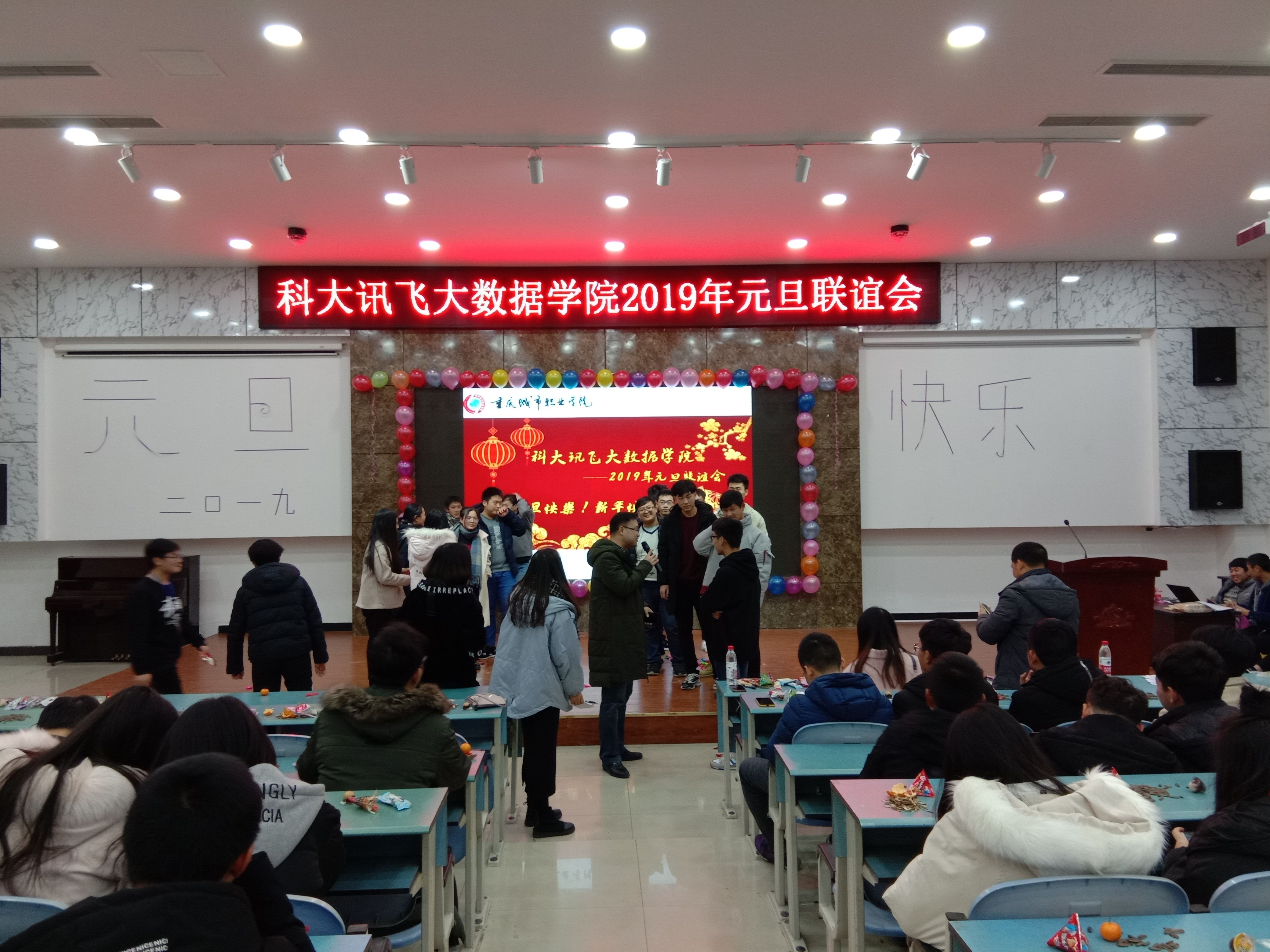 12月31日晚,科大讯飞大数据学院2019年元旦联谊会在文华楼学术报告厅顺利举行。系党总支书记潘峰,辅导员吴秋菊、曾静,科大讯飞公司老师黄天春和190名学生一同参与活动。