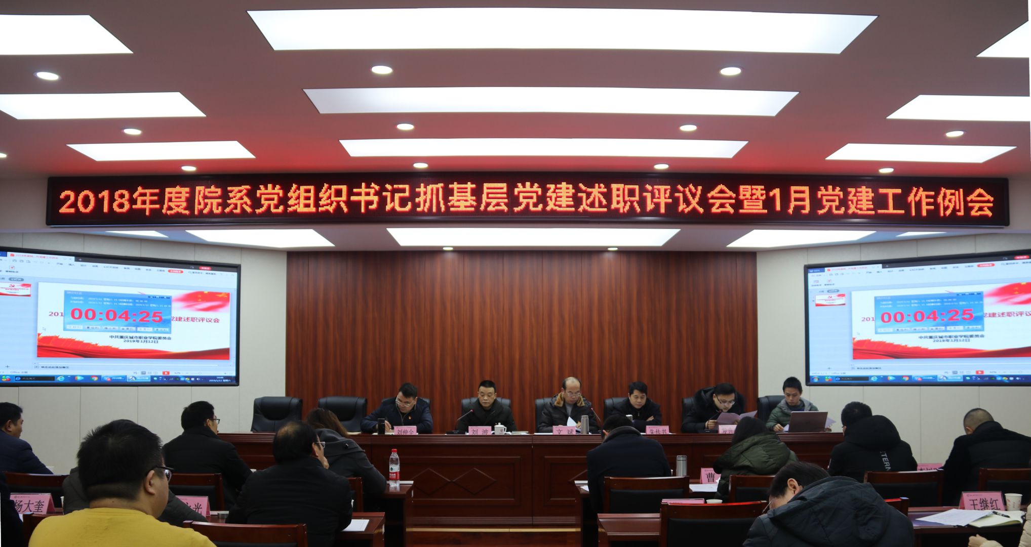 1月12日,学院党委在博学馆510会议室召开2018年度院系党组织书记抓基层党建述职评议会暨1月党建工作例会。在校院领导,各部门主要负责人、各院(系、部)主任、总支书记、专职组织员和各基层党支部书记参加会议,会议由党委委员、副院长文斌主持。