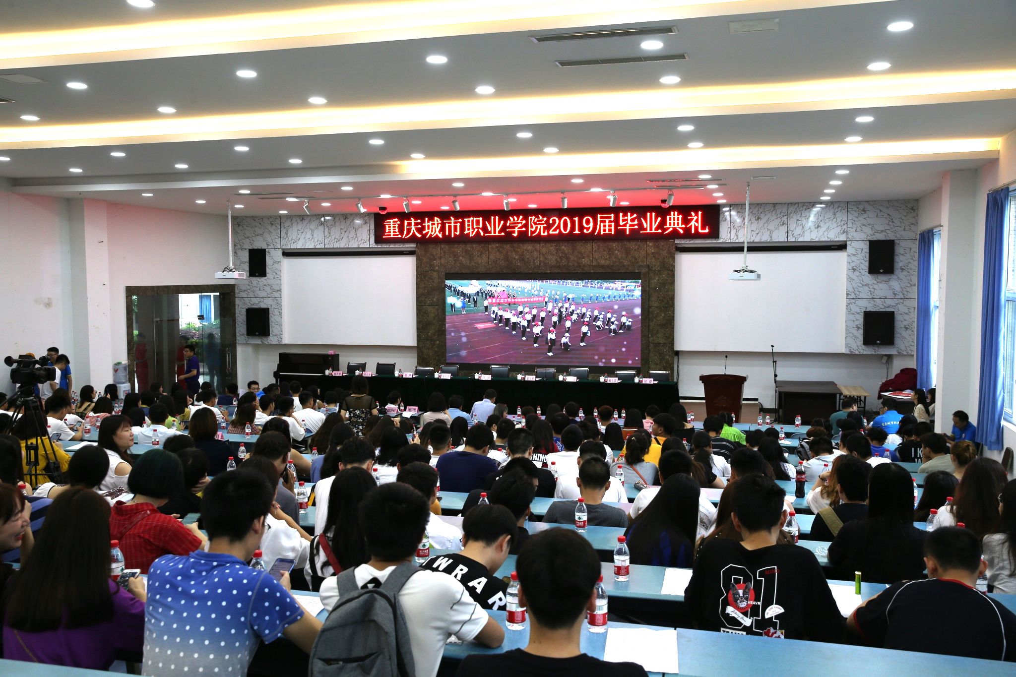 典礼开始前,文华楼前树立签名墙和照片墙供毕业生们签字留念。学术报告厅大屏幕播放毕业纪念视频,从刚进校时的懵懂到如今的从容自信,一张张照片,一段段影像记录着2019届毕业生在城职的时光。