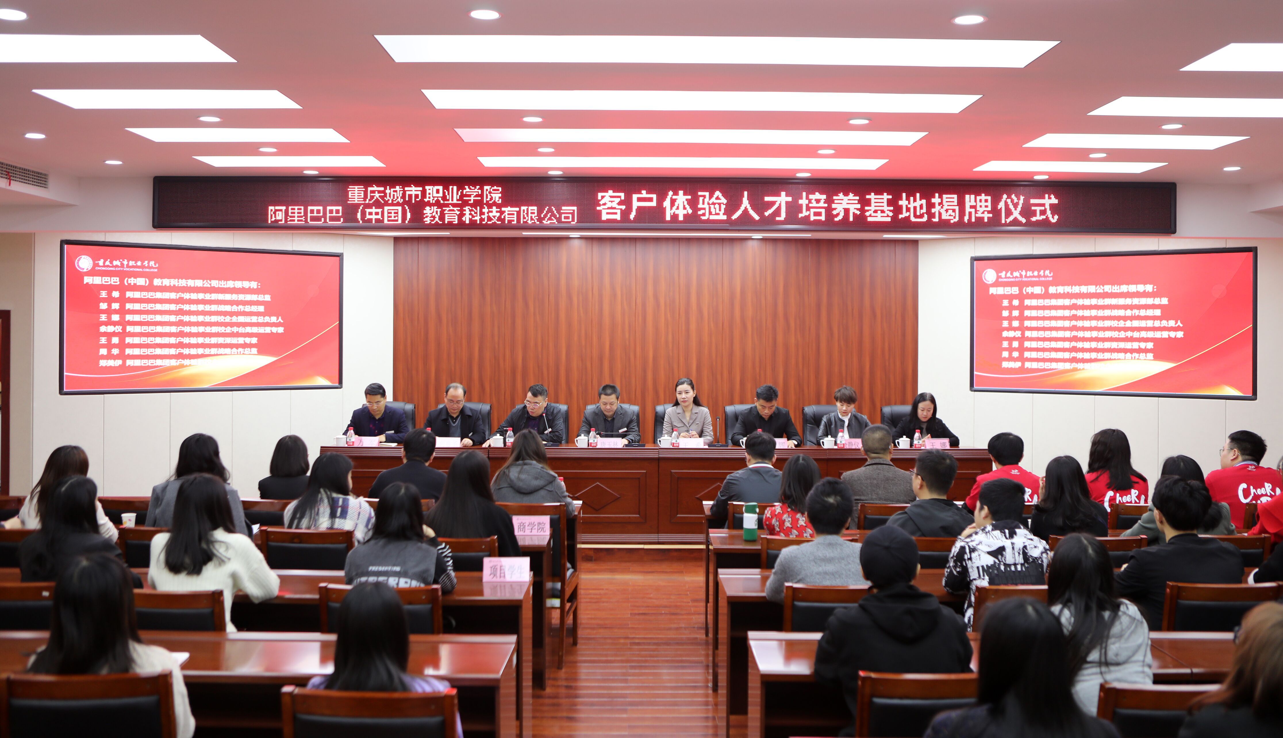 随后,在与会人员共同见证下,唐玉林校长和王希总监揭开红绸,标志着重庆城市职业学院—阿里巴巴(中国)教育科技有限公司客户体验人才培养基地正式落成。