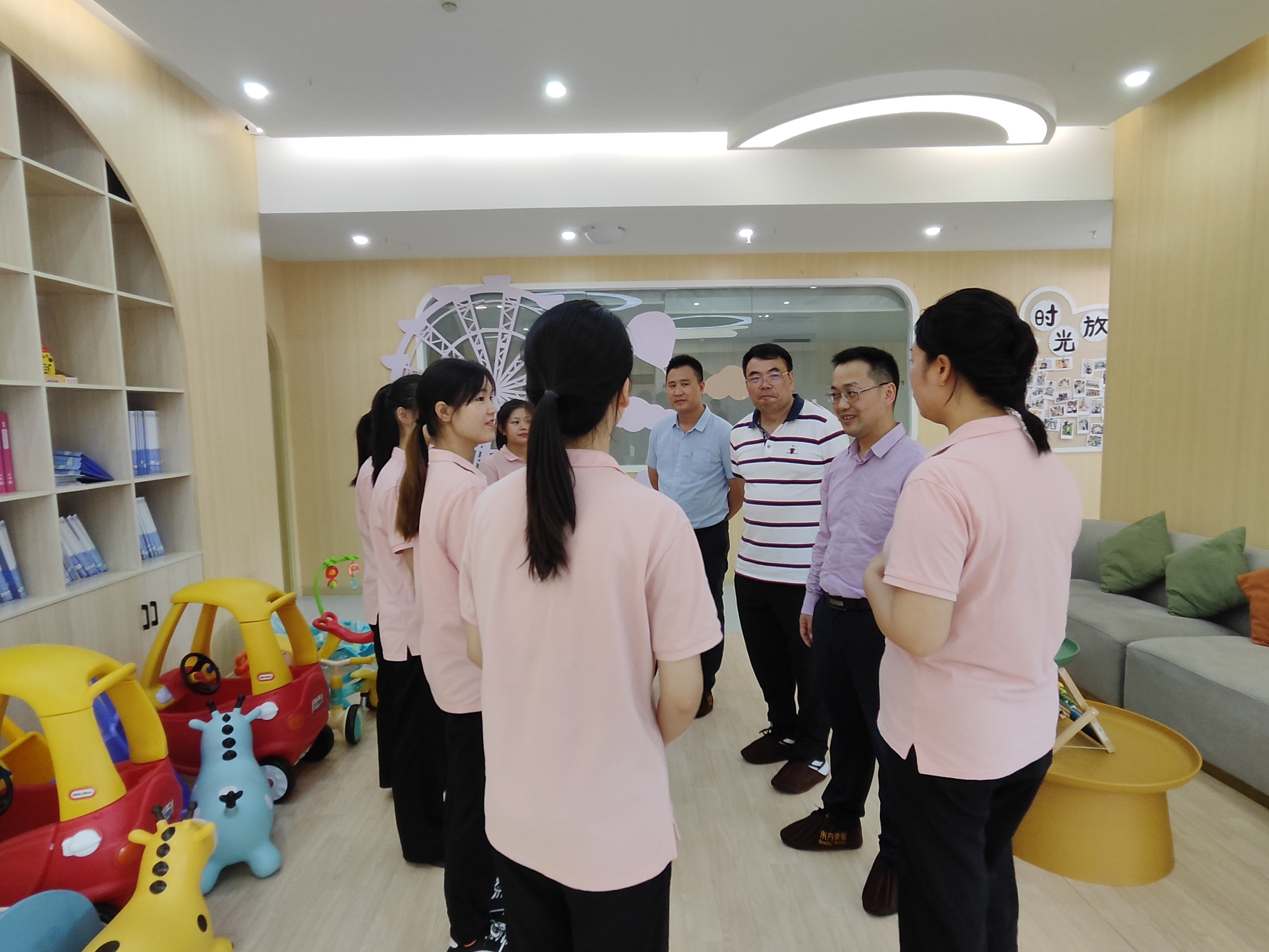 张绍荣一行在校区负责人邓春静的陪同下,参观了早教中心各个不同年龄段的班级、教学区、游戏区、休息区等,详细了解东方爱婴早教中心的发展历程、教学理念和课程设置,并就双方下一步深化校企合作进行了交流。