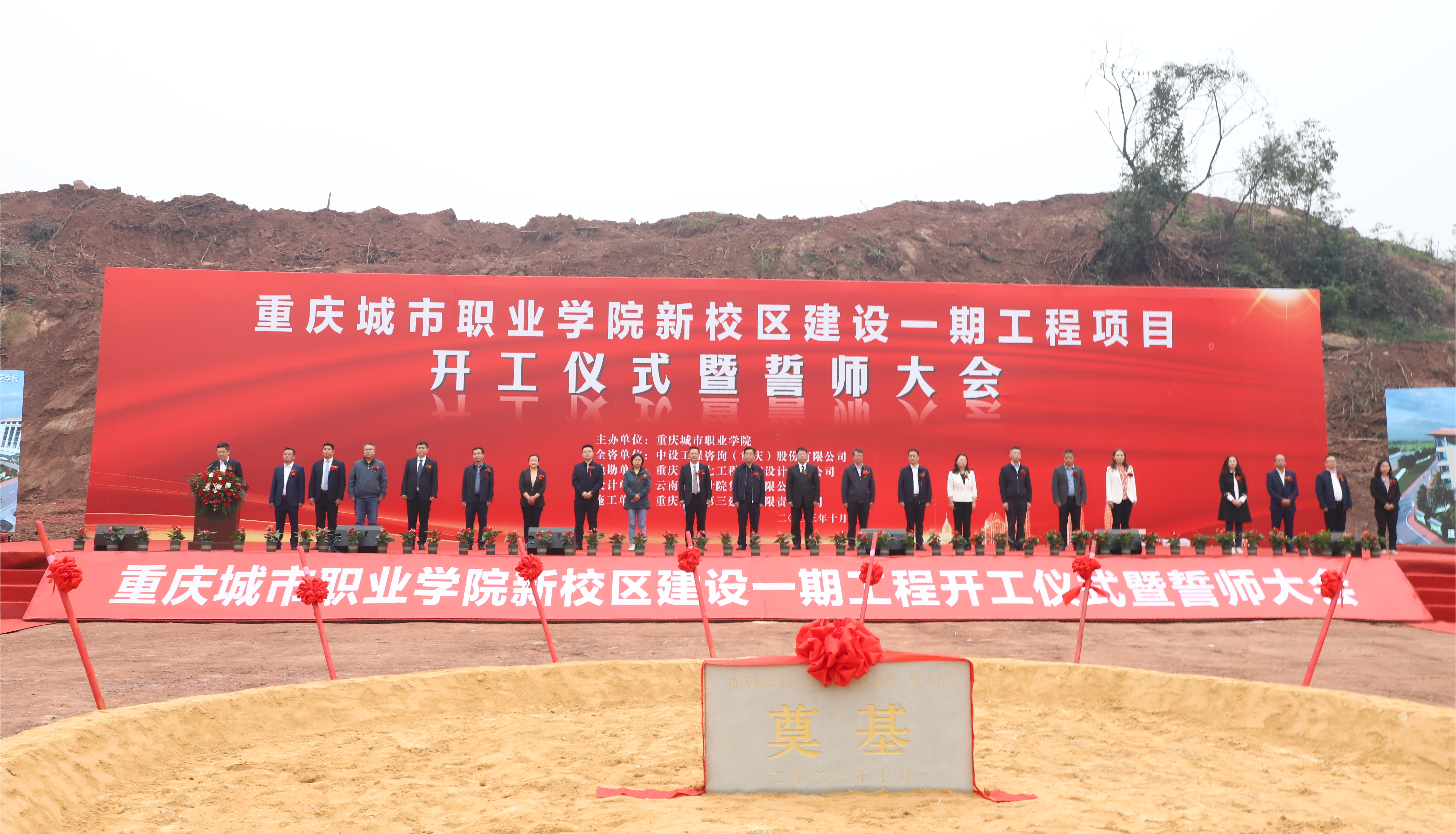 10月24日上午,重庆城市职业学院新校区开工奠基仪式在新校区施工现场举行。永川区人大常委会副主任张正元,区政府副区长宋朝均,国家督学、重庆市职业教育学会会长张荣,永川区发展改革委员会副主任何欢、区教育委员会副主任吴志君、区住房和城乡建设委员会主任张静、区土地储备整治中心副主任严明桂、高新区管委会(西部职教基地建设管理委员会)副主任皮生琴、中山路街道办事处主任屈英、陈食街道办事处主任周强,重庆建工第三建设有限责任公司党委书记、董事长杨帆,云南省设计院集团第四建筑设计研究院总建筑师唐春晓,中设工程咨询(重庆)股份有限公司董事长黄华华,重庆六零七工程勘察设计有限公司总工程师温健,重庆城市职业学院党委书记张绍荣,校领导文斌、朱传书、陈志军参加仪式。仪式由学校党委副书记、校长唐玉林主持。